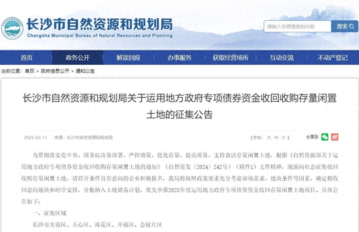 2月11日,长沙市自然资源和规划局发布《关于运用地方政府专项债券资金收回收购存量闲置土地的征集公告》,明确自2月11日至2月20日,面向长沙市芙蓉区、天心区、雨花区、开福区、会展片区征集收回收购存量闲置土地。